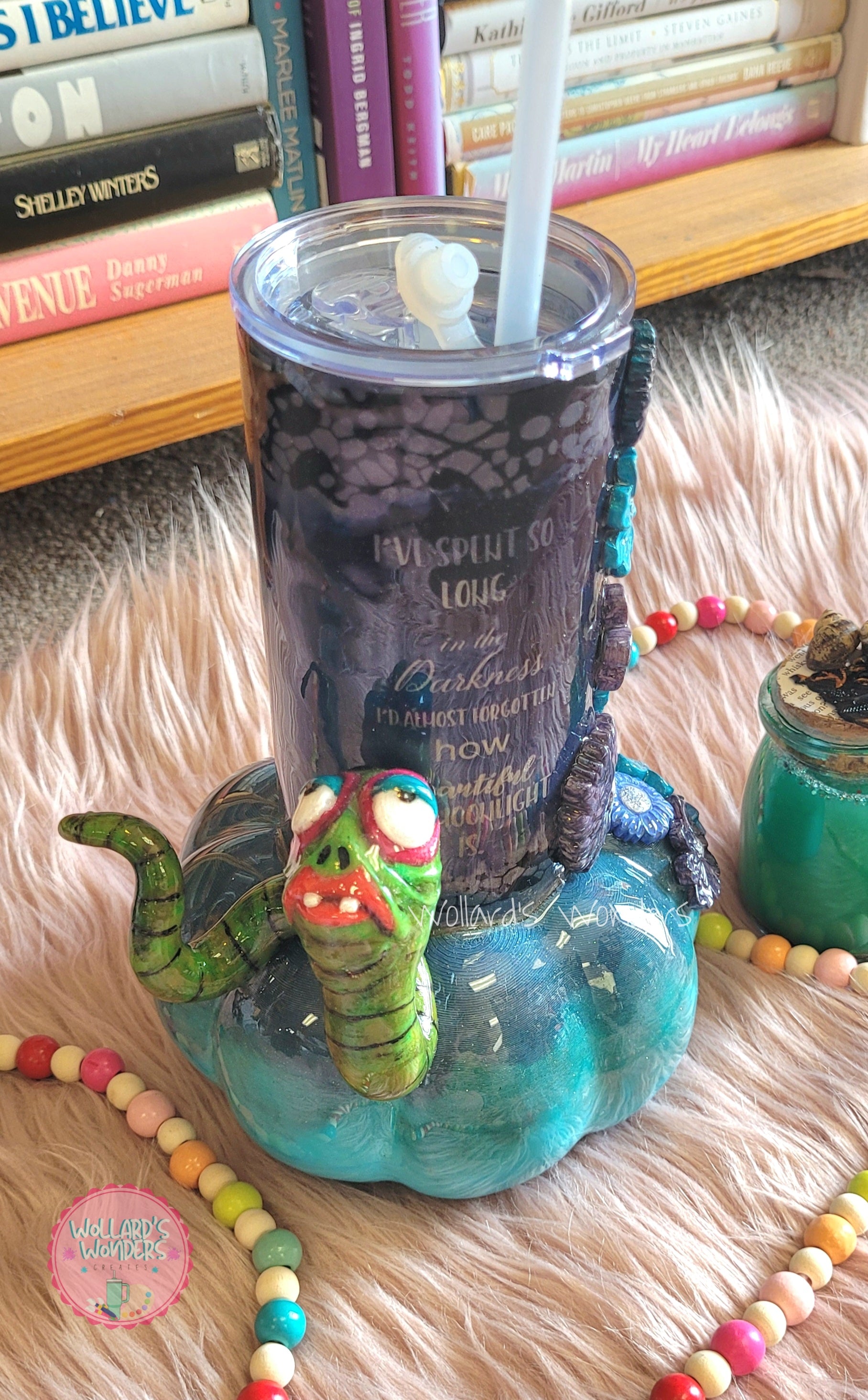 20 oz tumbler with a 3d printed pumpkin and hand sculpted worm detail